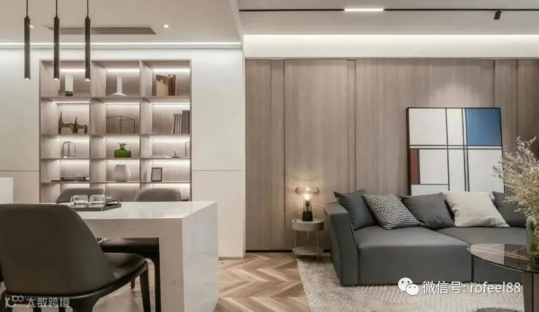 客厅与餐厅相通,视觉上扩大了客厅的空间,餐边柜的木质开放格与客厅背景墙相呼应,整体性非常强。玄关柜与餐边柜连接起不同的空间格局,开放与封闭式相结合的收纳柜整洁大方,开放格里加入灯带,摆放上自己喜欢的摆件,生活更加精致有趣。
