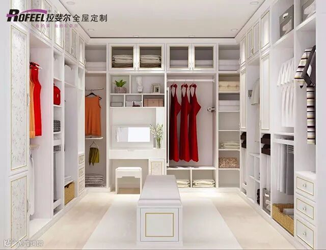 设计一款浅色系的衣帽间。白色、奶黄色、浅蓝色都可以,以白色为佳。白色是时尚之色,在设计上能给人更好的延伸感,达到更为开阔明亮且清爽大方的视觉效果。白色也是所有颜色的底色,它能将其他色衬托的更纯净,亦能将黑色凸显的更深邃。在色彩丰富、物品繁多的空间下,能轻而易举的分辨出你需要寻找的衣物,给予你更多的换装的时间。