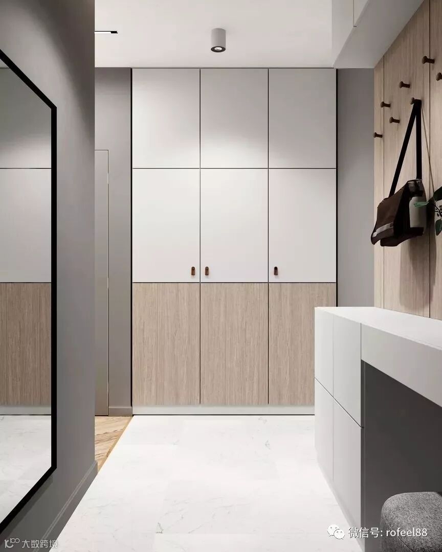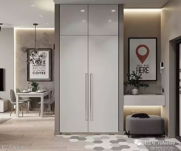 门厅这个位置,安装了顶天立地的门厅柜,可以增加房间的隐私性,同样在收纳上作用也很大。住户进出门的时候,可以把一些平时经常用的东西放在这个门厅柜内~