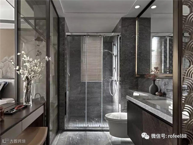 这是卫生间,主卫墙面整体采用黑色仿石砖贴面与地面瓷砖一致。统一中寻求些许的变化。挂墙式马桶不留卫生死角,打扫方便。淋浴区与马桶之间用玻璃隔断,好看实用又好打理。