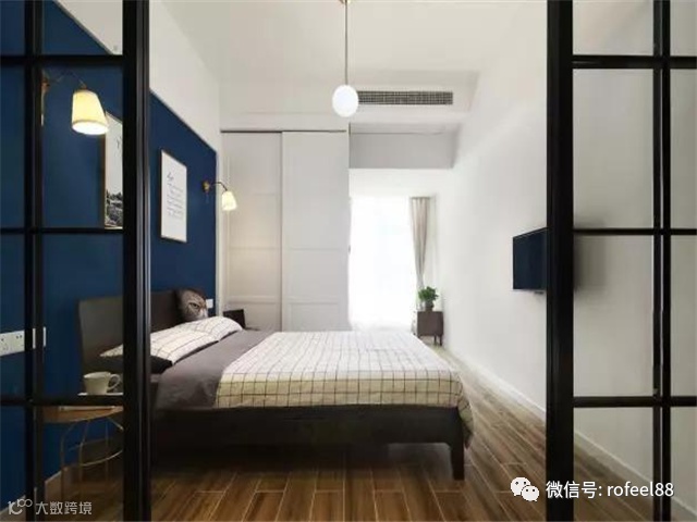 卧室在客厅旁边,用玻璃门隔开,装上帘子完美保护隐私。主卧室的床头背景墙刷宝蓝色墙漆,再加上温馨的木地板和实木床,给人带来了一种清新、优雅又舒适的感觉。定制白色到顶衣柜,完美收纳小两口的衣物。卧室视觉效果绝佳,光线很足,休闲、储物空间应有尽有。