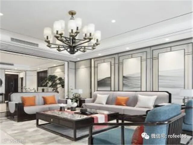 进门是玄关,经过过道到达客厅。客厅去掉了复杂的中式背景,在顶部安装白色吊顶灯,增加了空间的明亮度,给人一种清新大气的感觉。同时胡桃色的实木沙发配上亚麻色和蓝色的软包更是加强了空间视觉感。胡桃色实木沙发和白色灯具打破了空间的压抑感,让新中式风格装修的客厅多了一份生气和精彩。