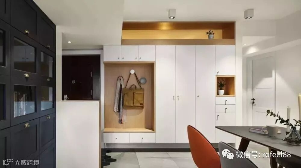 首先我们可以在玄关处打一个玄关柜,这样家里有百分之五十的东西都可以存放起来,另外我们的玄关柜可以做到顶或者做成嵌入式的,这样顶柜就不用担心积灰了!