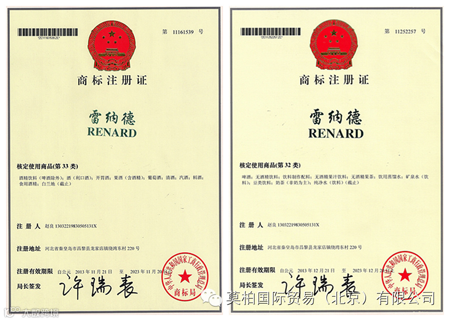 上图是雷纳德32类33类商标注册证