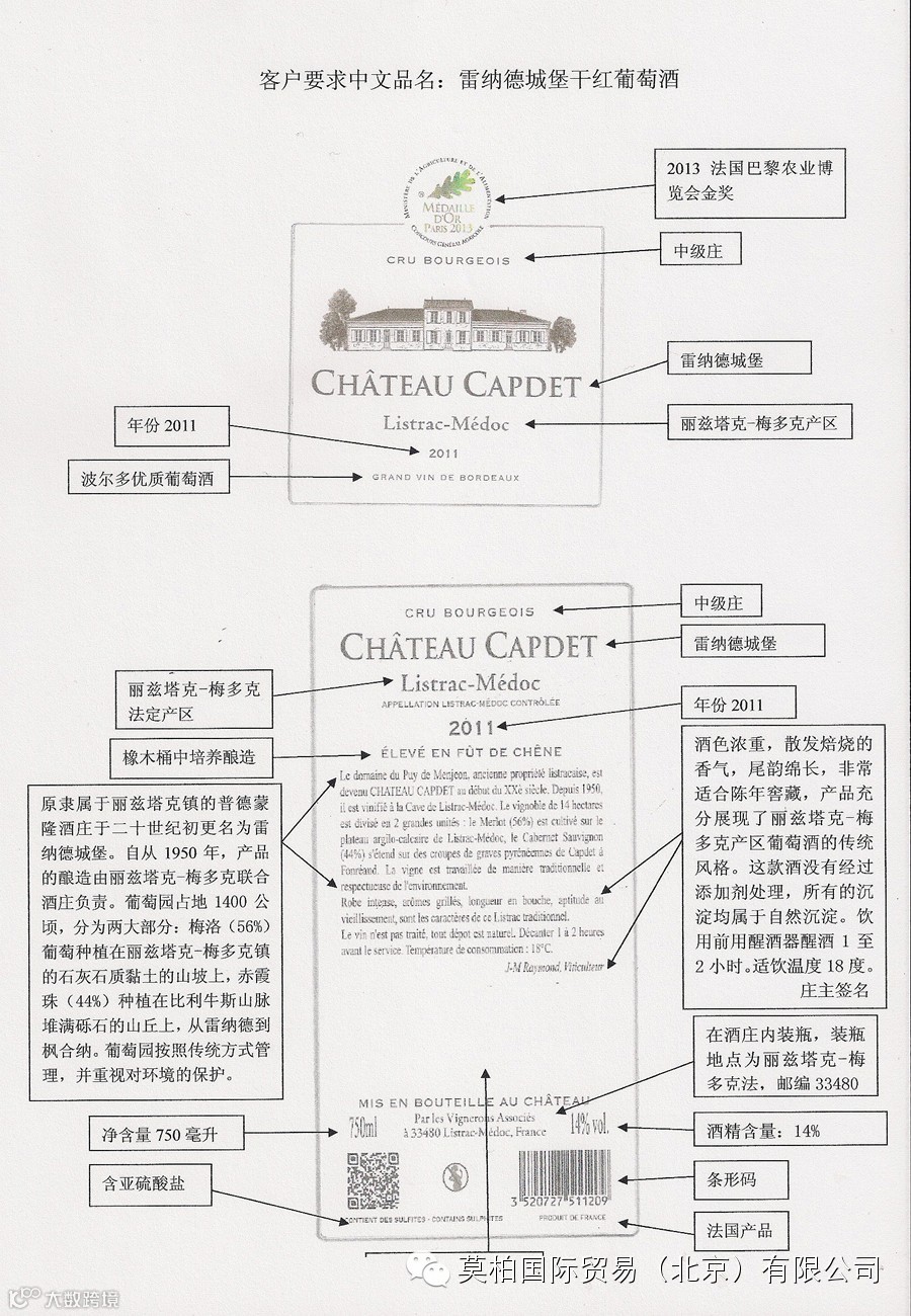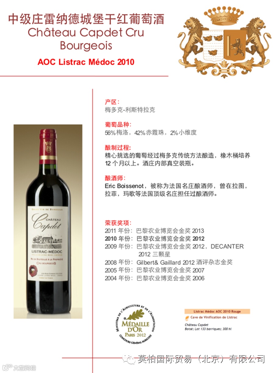 精心挑选的葡萄经过梅多克传统方法酿造,橡木桶培养12个月以上。酒庄内部真空装瓶。
