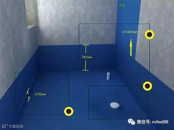 2、通常对墙面做防水工作,防水涂料要刷到30cm的高度;但淋浴区或者摆放柜子的墙面,则至少需要要刷到1.8m的高度,有条件的可以直接刷到顶,更为保险。