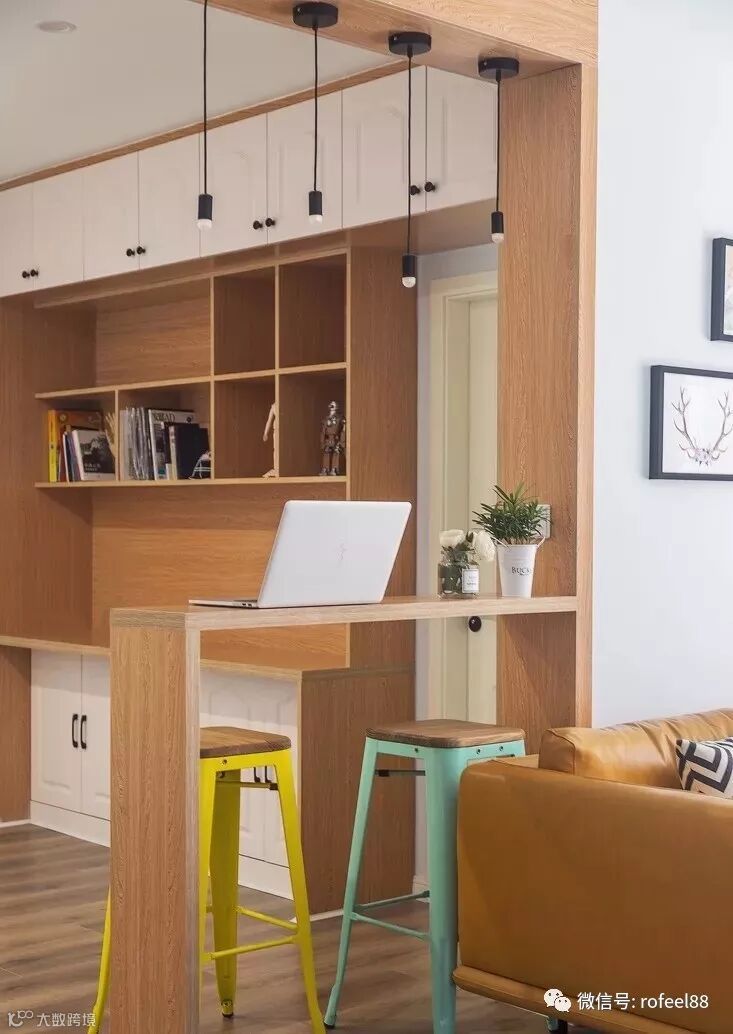 将儿童房的位置移出增加多功能活动区域,采用吧台设计作分割,隔而不断并从视觉上扩大过道面积。
