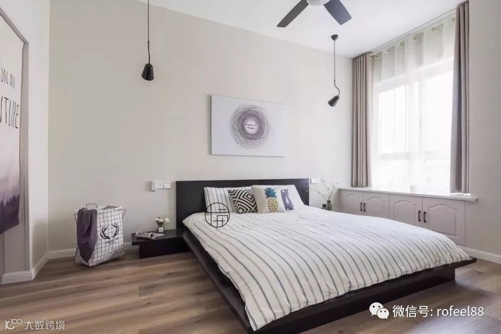 主卧整体以简约为主风格,浅色空间搭配深色家具,简简单单营造舒眠氛围。