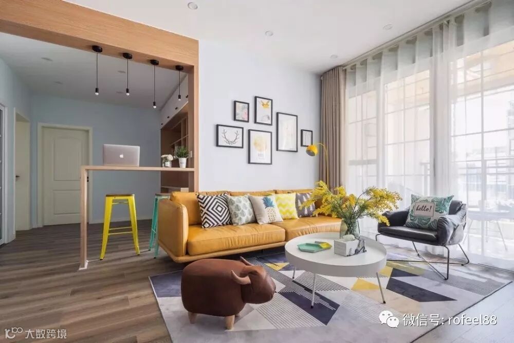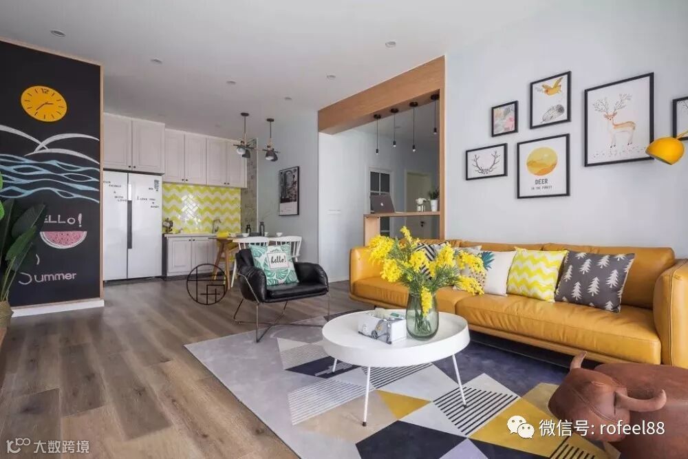 清浅干净的硬装搭配跳跃暖色软装,公领域空间充满活力。