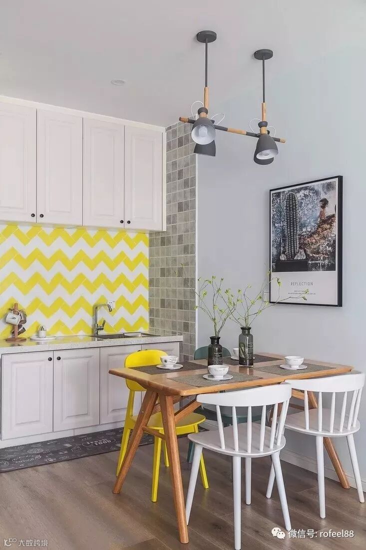 餐厅与客厅互通,保证餐厅采光,整体风格延续公领域的格调,餐边增设西厨,亮黄色瓷砖拼贴出动感背景。