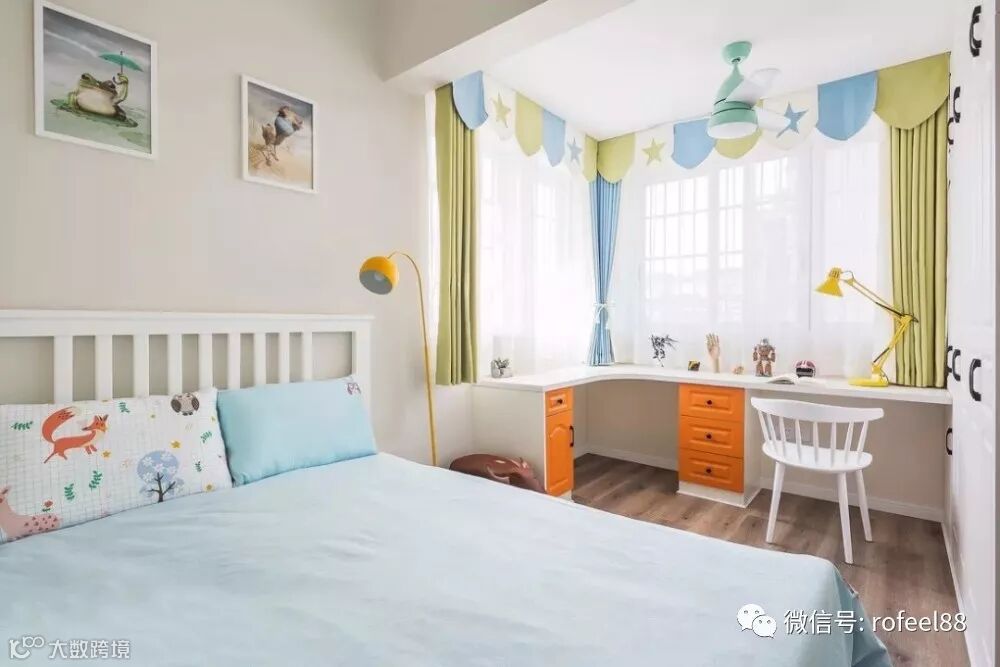 儿童房柔和的墙面颜色,搭配蓝绿拼色窗帘,靠窗木作写字台,增加空间机能。