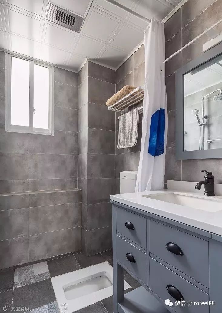 主卫灰色搭配局部花砖点缀,蓝灰色成品台盆柜与整体风格完美相搭,小空间蹲坑淋浴空间功能重叠。