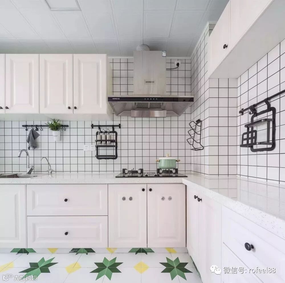 厨房花砖地面,搭配墙面白色方砖与黑色美缝,打造北欧料理空间。
