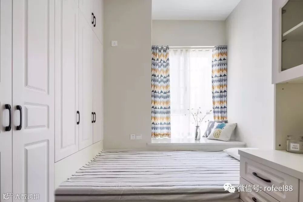 客房木作榻榻米床铺与大面积收纳柜,休闲飘窗依然打造的清新可人。