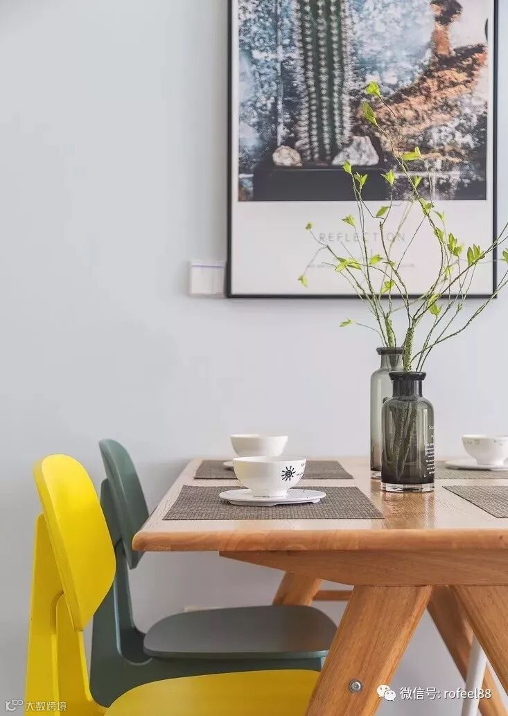 简单的木质餐桌搭配撞色餐椅,呈现无限自然生机。