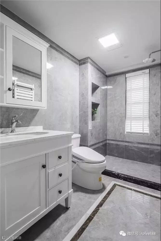 卫生间同样以灰白两色为主调,整个空间干净整齐,突出现代感。淋浴间内设置壁龛,作为洗浴用品的收纳之处,合理利用空间,美观又兼具了实用性。