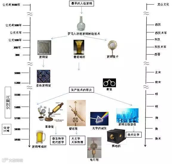 玻璃在西方生产和应用的历史。左轴为以公元年代为标记的时间轴,右轴标记了每个时间点所对应的中国历史朝代。每一事件或发明的时间均参考wikipedia。