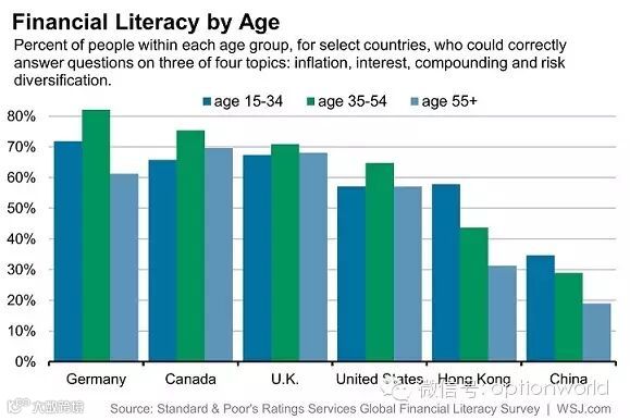 此次调查同时还包括了年龄段的选项。而结果显示,在发达国家中,中年人(35-54岁)普遍比年轻人和老年人要更了解理财产品。