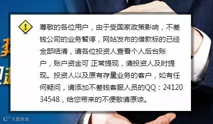2015年12月18日晚9点50,浏览P2P平台不差钱,打开网站之后1秒钟,首页弹出一则公告,大意为受国家政策影响,该公司业务暂停,网站发布的借款标的已经全部结清,提醒投资人查看个人账户并及时提现,同时留下了咨询在线方式。