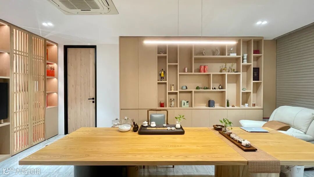 T型一体式书桌设计 - 格栅背景墙 · 斜切抽屉拉手设计 · 百隆托底导轨