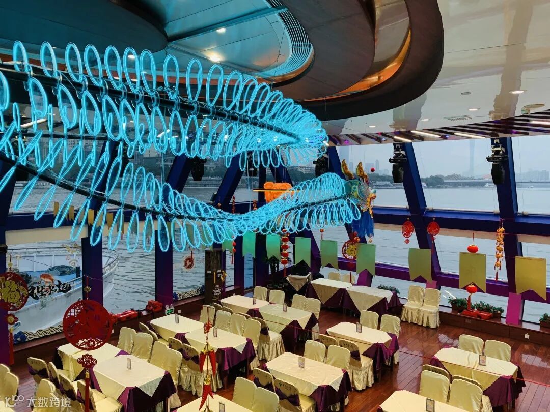 广州财富号游船顺应趋势玩起跨界,把国潮搬到船上,过道、走廊、屏风、楼梯转角,处处都是惊艳的新国潮布置,还有广东人至爱的粤语金句。大量的岭南元素与潮流元素在船上进行创意融合,散发着属于新国潮的魅力。