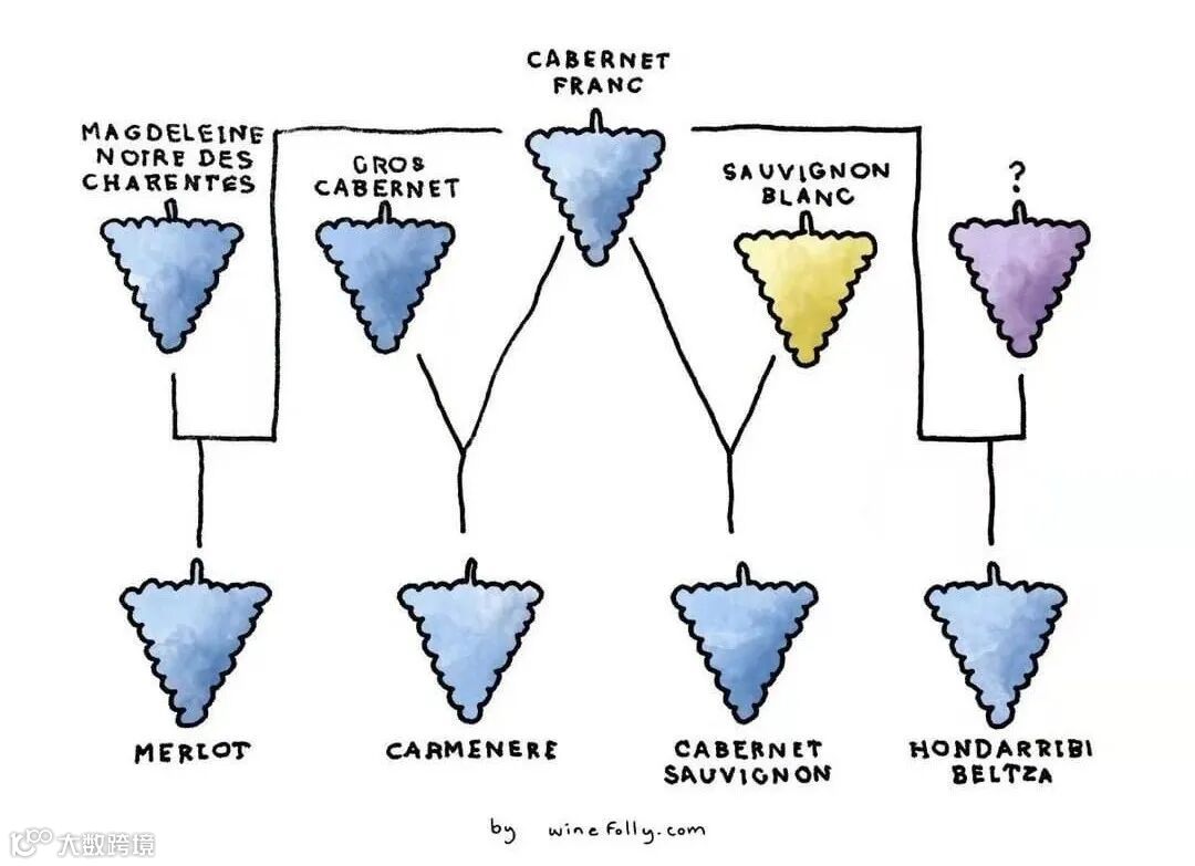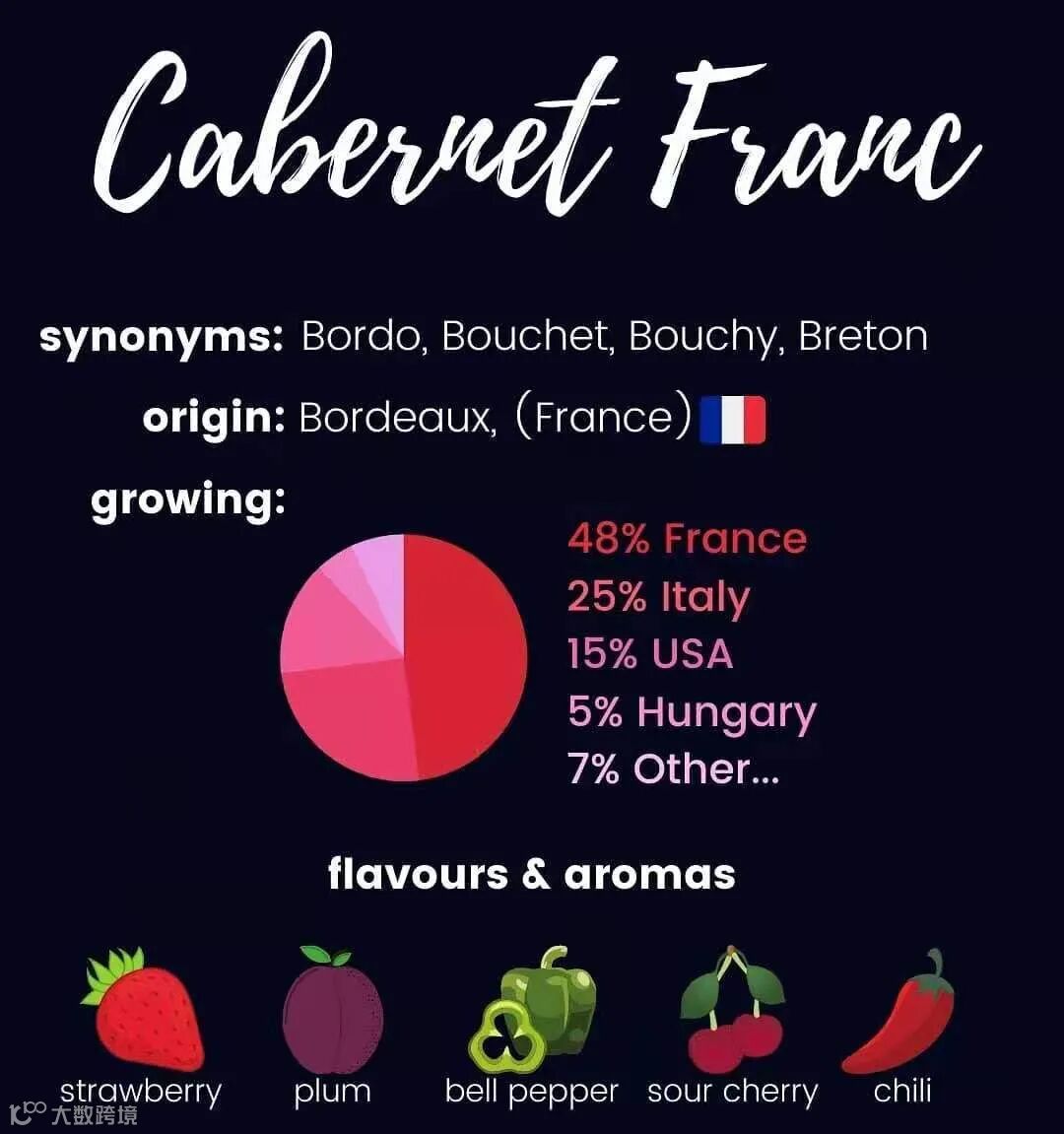 波尔多:它与赤霞珠和梅洛一样,是构成法国波尔多酒和世界其它产区波尔多风格混酿(有些酒标上也叫梅里蒂/Meritage)的三种主要葡萄之一。