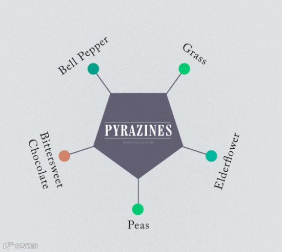 吡嗪[bǐ qín]( pyrazines),全称甲氧基吡嗪(methoxypyrazines):品丽珠酒中有一种迷人的味道,就是一种常被称为甜椒(bell pepper)的令人放松的香气。在温暖的气候下,它的香气有点甜,像烤红辣椒或辣椒香料巧克力,但胡椒的特性是显著的。