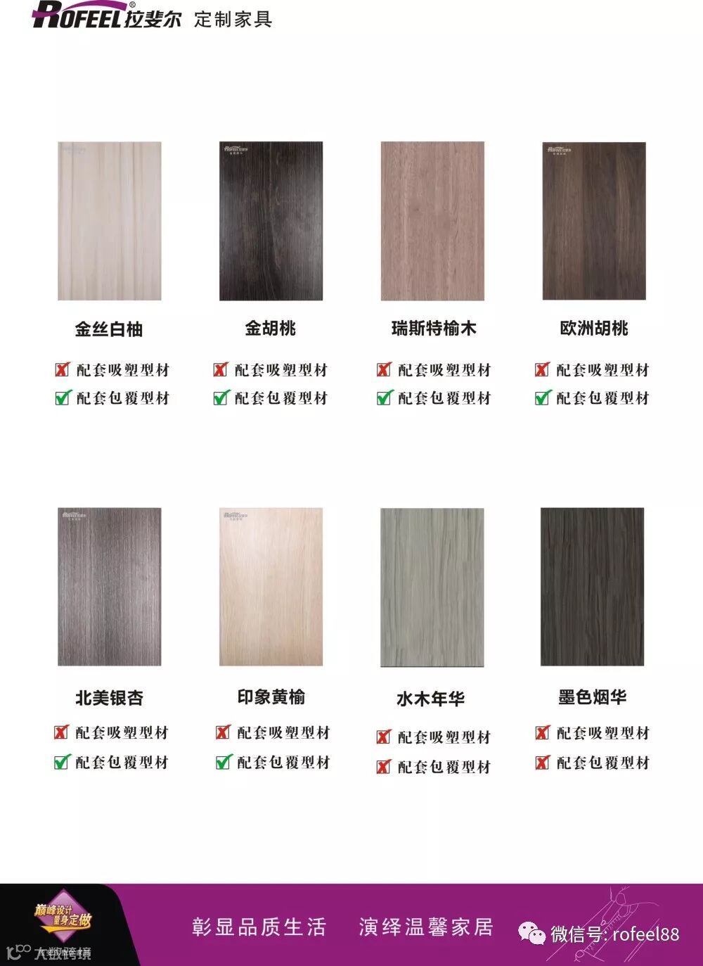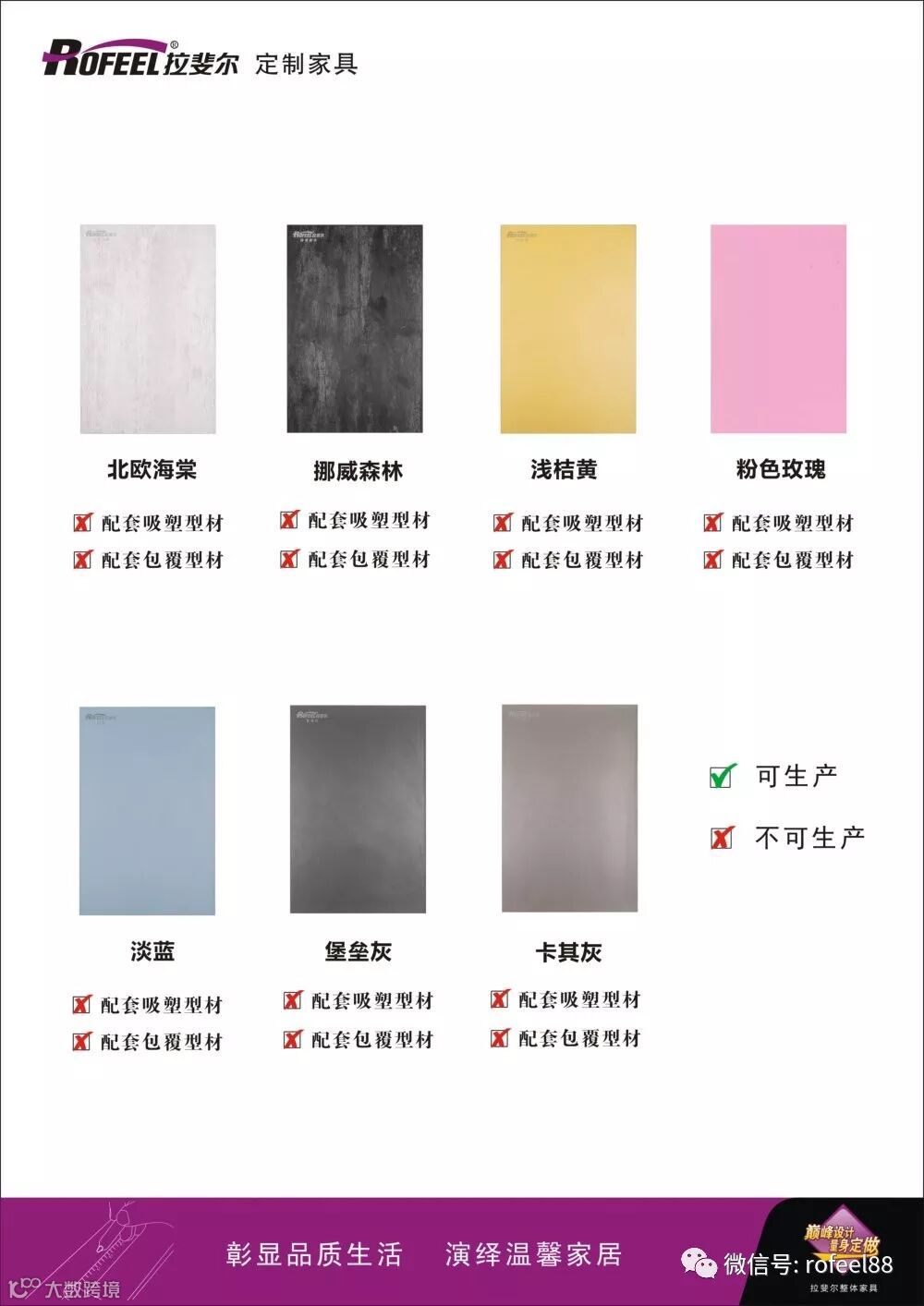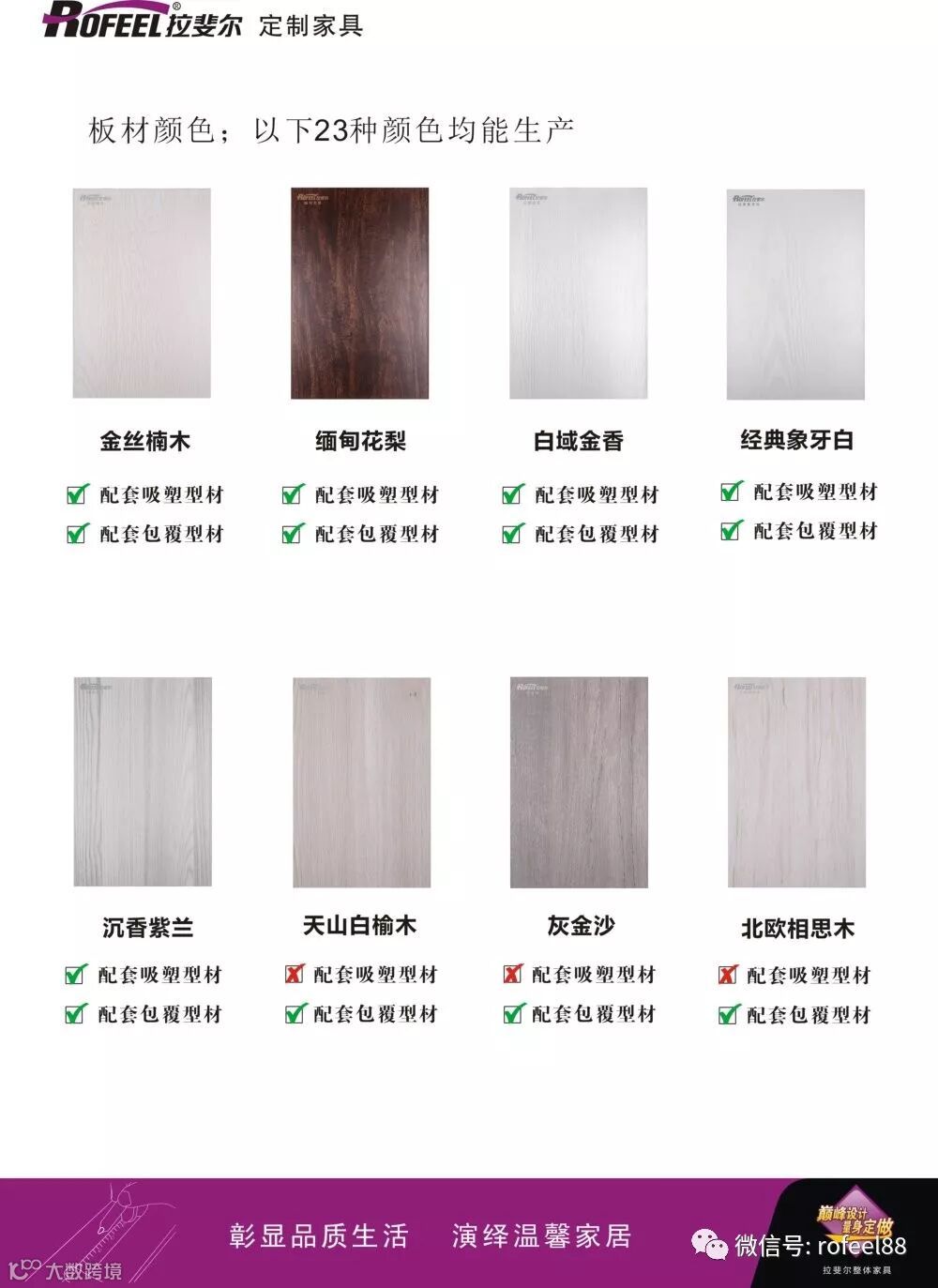 为了符合市场发展和消费者需求,拉斐尔全屋定制对色板“优胜略汰”,浓缩精华。目前我司可以生产的色板颜色总共为23种,可营造混搭设计成多种产品风格。每一款色板都有它独特的个性,受到广大消费者的青睐!