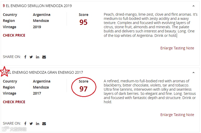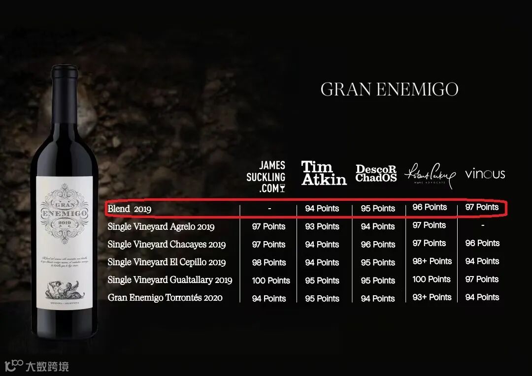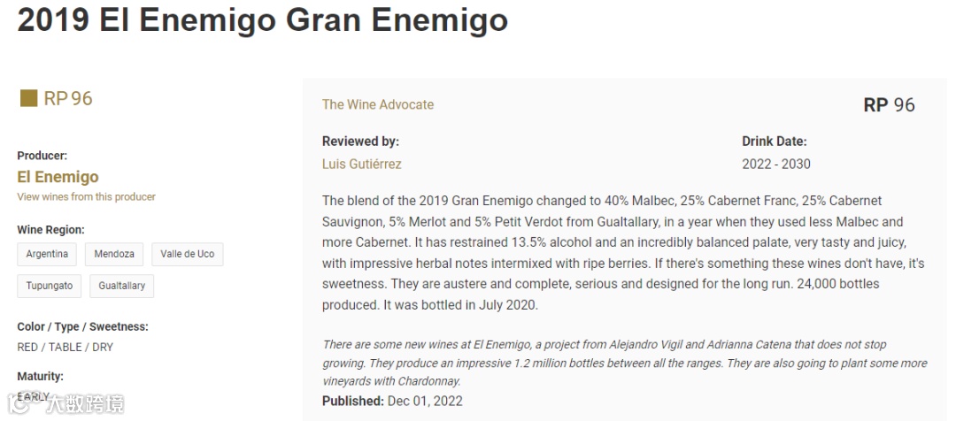虽是多品种混酿,但不同年份的葡萄比例不一定相同。继其以#17的排名在James Suckling TOP 100 WINES OF ARGENTINA 2021 报告中获得了97高分后,最近又在由Joaquin Hidalgo为Vinous.com撰写的《乌科山谷:不同风土的魔力所在/The Uco Valley: Where Diverse Terroirs Work Their Magic》报告中再次斩获97高分的好评。