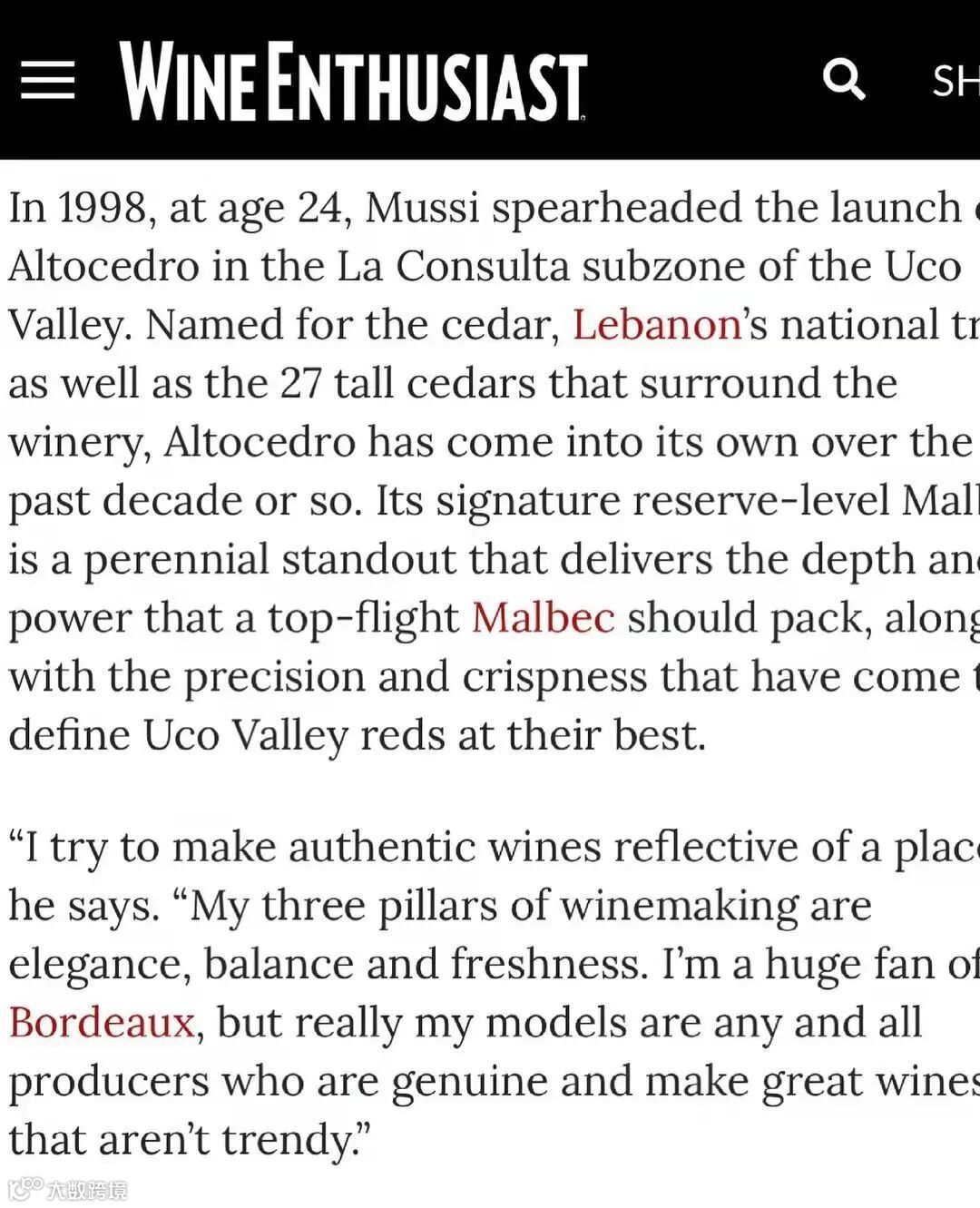 1998年,24岁的穆西率先在优克谷的拉孔苏尔塔(La Consulta)子产区启动了Altocedro项目。Altocedro以黎巴嫩的国树“雪松”以及环绕酿酒厂的27棵高大雪松命名,在过去十年多年的时间里,Altocedro已经有了自己的独特标签。其标志性的珍藏级马尔贝克是一款经久不衰的佳酿,它拥有马尔贝克所应有的结构和力量感,以及优克谷红葡萄酒的特点——精练和爽脆。