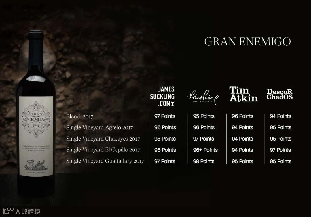 这里也是Gran Enemigo所用的马尔贝克和品丽珠的产地,Gran Enemigo是亚历安娜酒庄(Bodega Aleanna)的高端产品线,而Vigil也是该品牌的酿酒师兼合伙人。通过Gran Enemigo系列以及El Enemigo品牌的其它酒款,Vigil成功地打造了阿根廷醉值得收藏的葡萄酒之一。”