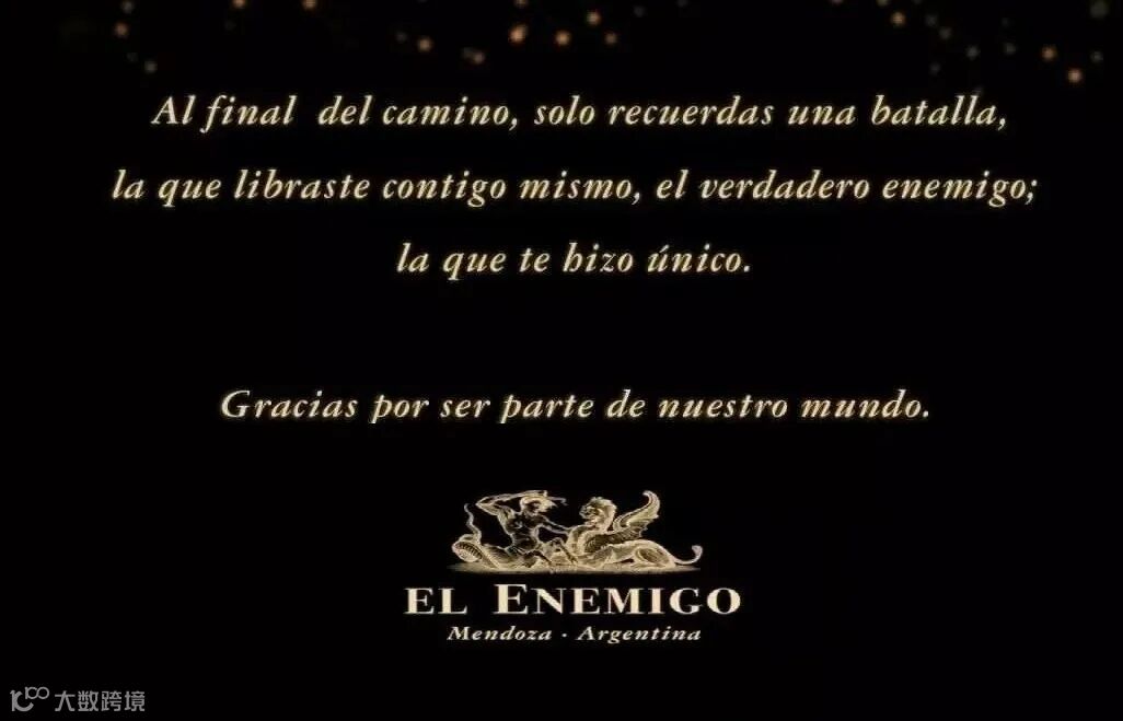 El Enemigo名字的寓意是:敌人(The Enemy)。拿到酒款,你会看到,他们的解读是:"At the end of the journey, we remember onlyone battle: the one we fought against ourselves, the original enemy. The onethat defined us. 人生路上,最大的敌人就是自己;唯有与自我博弈,方能铭记于心。战胜自我,享受人生珍贵。"