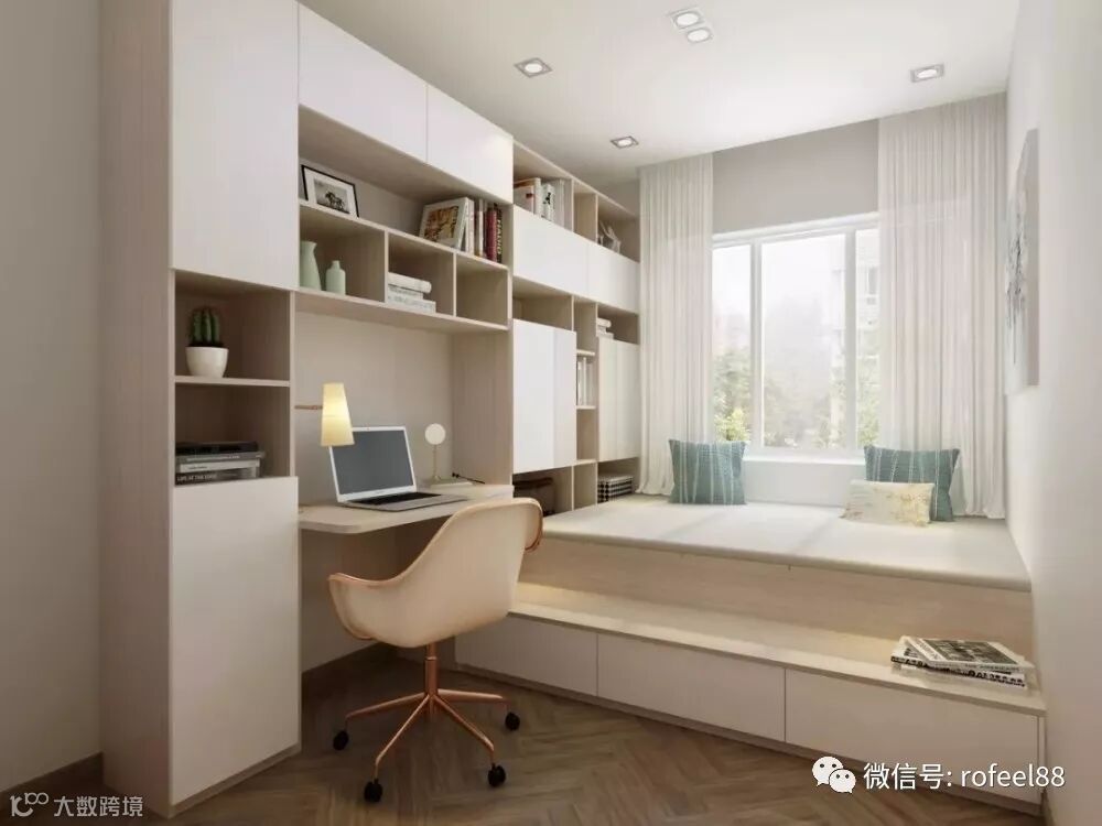 或者设置U型的榻榻米连结着书柜书桌,把书柜装到书桌的后面,方便转身就能拿到想要的书籍。