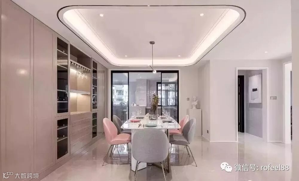 ▲石质餐桌与灰粉色餐椅,一整面墙的餐边柜,既能收纳也能展示之用。