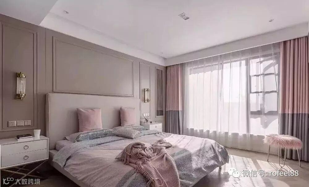 ▲主卧室的床头背景墙精致的线条感,搭配灰粉色调的床品+窗帘,打造温馨睡眠环境。