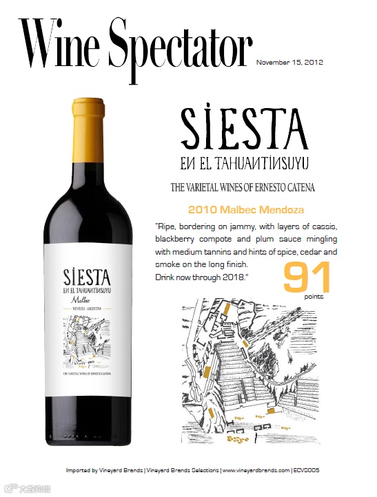 大多数葡萄,以及Siesta系列的所有葡萄,都来自“Finca Nakbé ”,ECV酒庄位于阿根廷门多萨的明星产区优克谷(Uco Valley),属于其下子产区图努扬的更小子产区Vista Flores,海拔3576英尺(1090米,这是一个178公顷的葡萄酒天堂,目前葡萄种植面积约116亩,主要种植马尔贝克、赤霞珠、西拉、品丽珠、黑皮诺、霞多丽等。葡萄园于2011年获得了Letis公司的有机认证,该公司总部位于阿根廷,拥有IFOAM认证。随后于2012年获得了德米特生物动力认证。