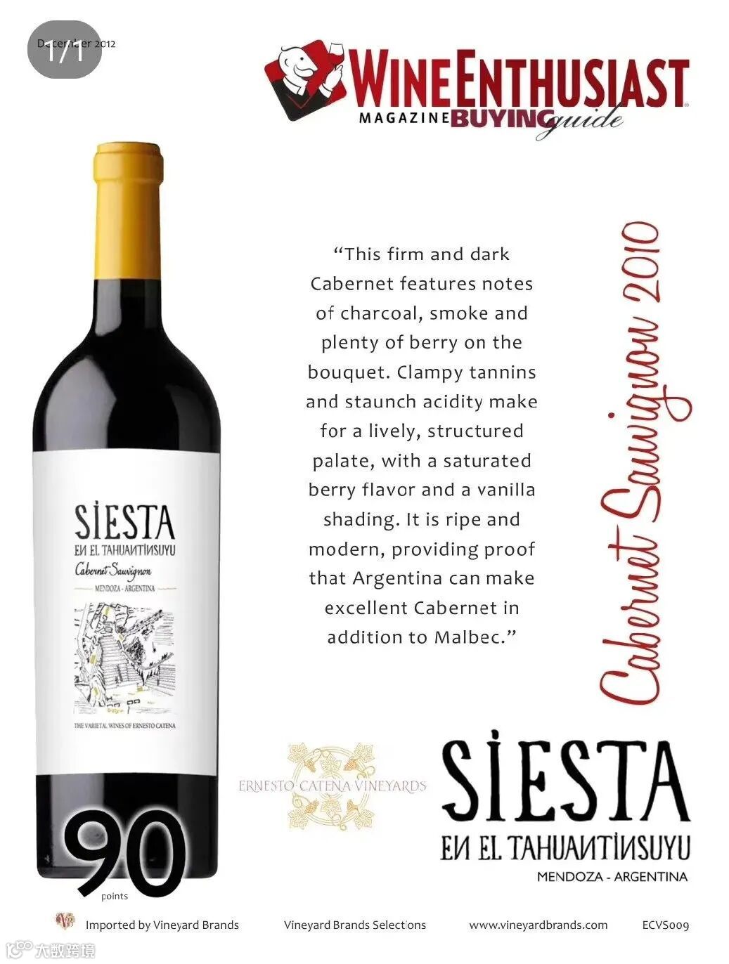 重瓶,陈年潜力强,性价比优秀, Wine Spectator 91pts, Stephen Tanzer 90pts, International Wine Cellar 90+pts。