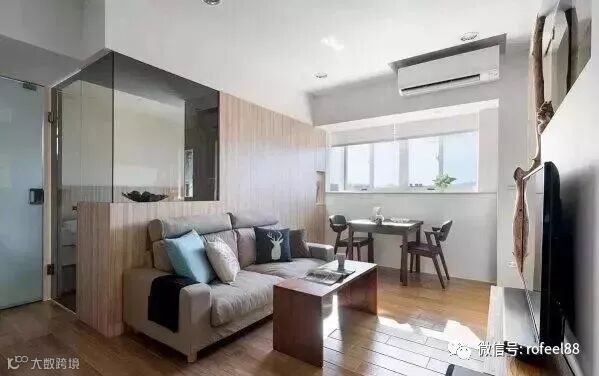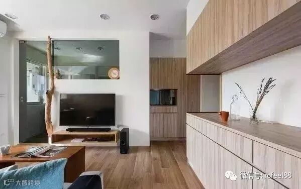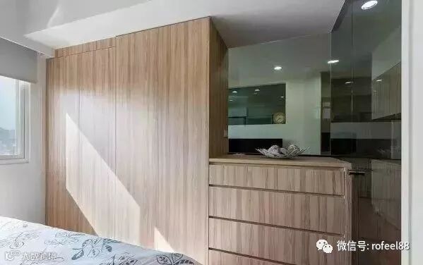 如果你觉得客厅与卧室的隔断是实体墙+双向玻璃,那就错了。其实是组合柜+双向玻璃,这样既有效划分空间,又增加卧室收纳。