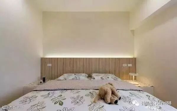 卧室空间巴掌大,几乎没有做装饰。仅在床头背景墙用木板做了装饰,并在上方安了灯带,温馨的睡眠空间立马呈现。