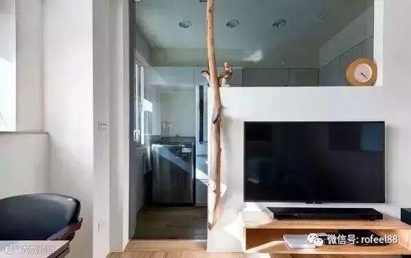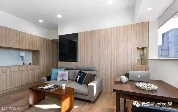 客厅沙发墙后面就是卧室,为了卧室的采光,采用双向镜做隔断,既保证了隐私,还获得了不错的采光。