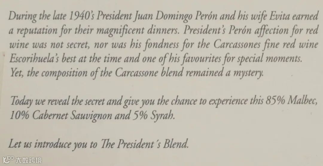 总统之选(The President's Blend)是嘎贡酒庄的顶级红酒,常驻阿根廷国宴用酒清单。不光是庇隆总统,此款酒也是深受其它总统们的喜爱。
