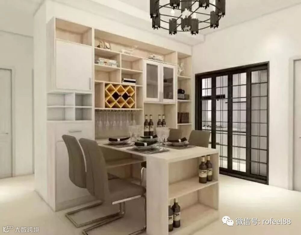 餐厅空间更需要整洁干净,一个大的收纳柜少不了。利用窗户位置设计一款餐边酒柜兼储物柜,增强收纳的同时,还可扩大餐厅空间。