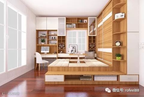许多家庭的面积较小,一般会将次卧和书房结合在一起,书柜书桌可以满足平时的学习和办公需求,加个榻榻米,可以休闲喝茶,有客人的话还可以当做洽谈室。