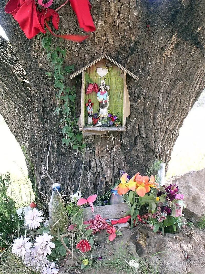 驱车在门多萨的高速公路上,道路的两旁经常会有大大小小的“神龛”,红色的布装饰着,里面有高乔人的模型,身着军装。而他们就是阿根廷的罗宾侠,身着红色高乔人的衣饰,劫富济贫。穿越整个门多萨省,高速的两侧都可以见到这个挂满红色小旗和装饰物的gauchito