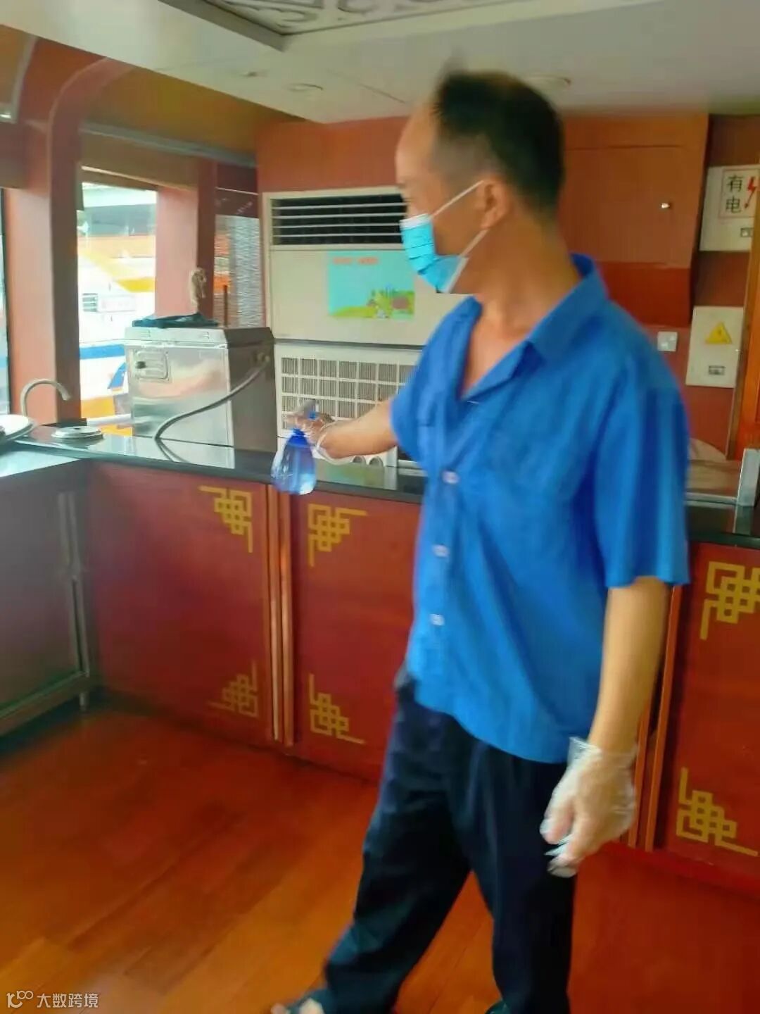 码头、船舶每日加强卫生消毒,包括安检口、候船厅、检票口、卫生间、售票区域、船舶客舱等公共部位。安检口、检票口、乘客座椅、栏杆、扶手、卫生间等人员可直接接触部位增加消毒频次。