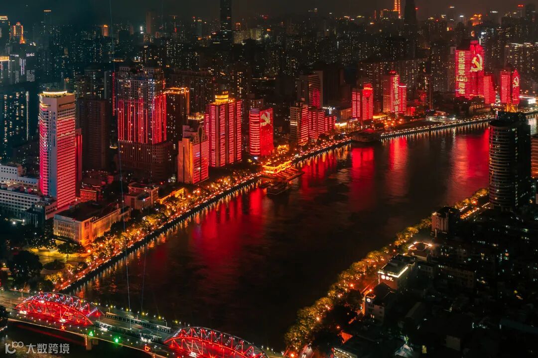 一带:沿江路24栋建筑媒体立面、琶洲人工智能和数字经济试验区建筑媒体立面、海心沙、九座桥梁。