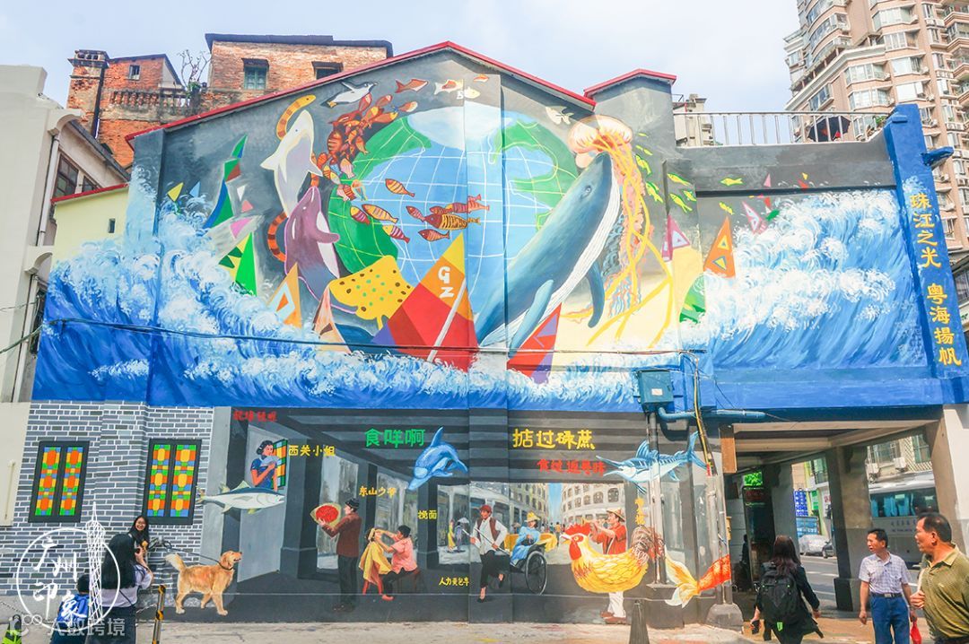 在万福路,有一面约160平方米,又潮又复古的“珠江之光,粤海扬帆”巨幅涂鸦墙。