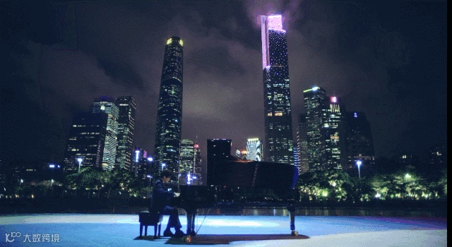 ●大湾区“城市跳动”光影秀,钢琴家的弹奏与粤港澳的城市景观融为一体,表达粤港澳同饮一江水、共谱一首歌,彰显广州与世界共结命运、共享机遇的大气形象。