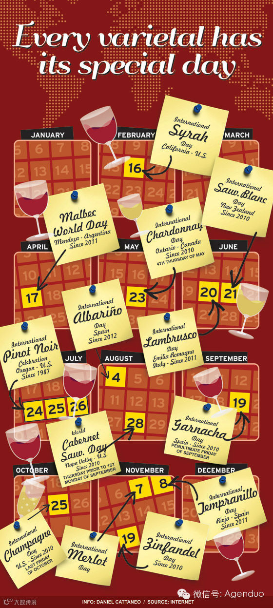 阿根廷特有的马贝克日早已如雷贯耳,使人铭记于心。或许在广大葡萄酒爱好者的心中马贝克是唯一一个拥有自己纪念日的葡萄酒品种但是根据最新调查显示事实并非如此。下图是根据各个葡萄品种而制定的一个日历表,哪些特定的日子是某个品种的纪念日都在这个日期表中彰显出来,同样还有一个专门为香槟而设定的“特别日”。