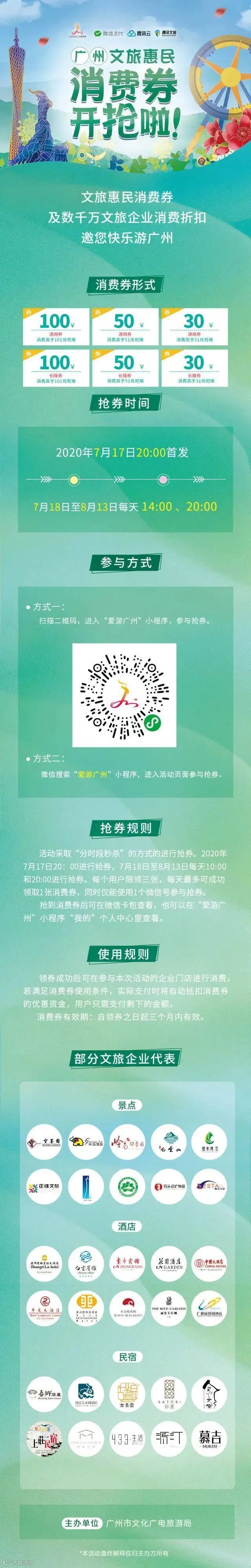 广州市民和游客每天在14:00和20:00,通过 “广州市文化广电旅游局”“爱游广州”微信公众号和“爱游广州”微信小程序,都可进入消费券活动页面,用“分时段秒杀”的方式抽取消费券。